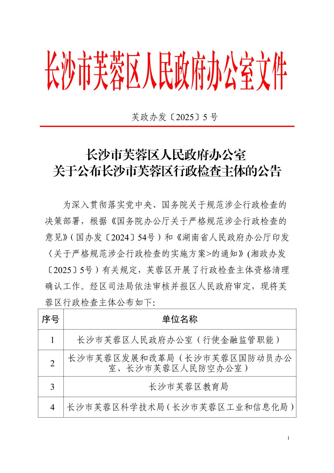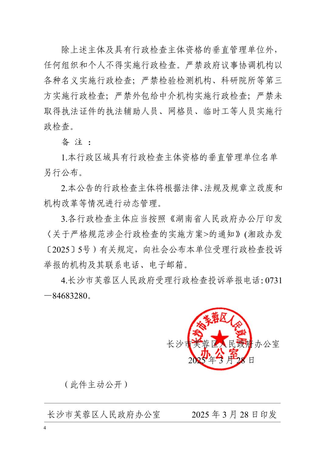 长沙市芙蓉区龙8国际办公室关于公布长沙市芙蓉区行政检查主体的公告