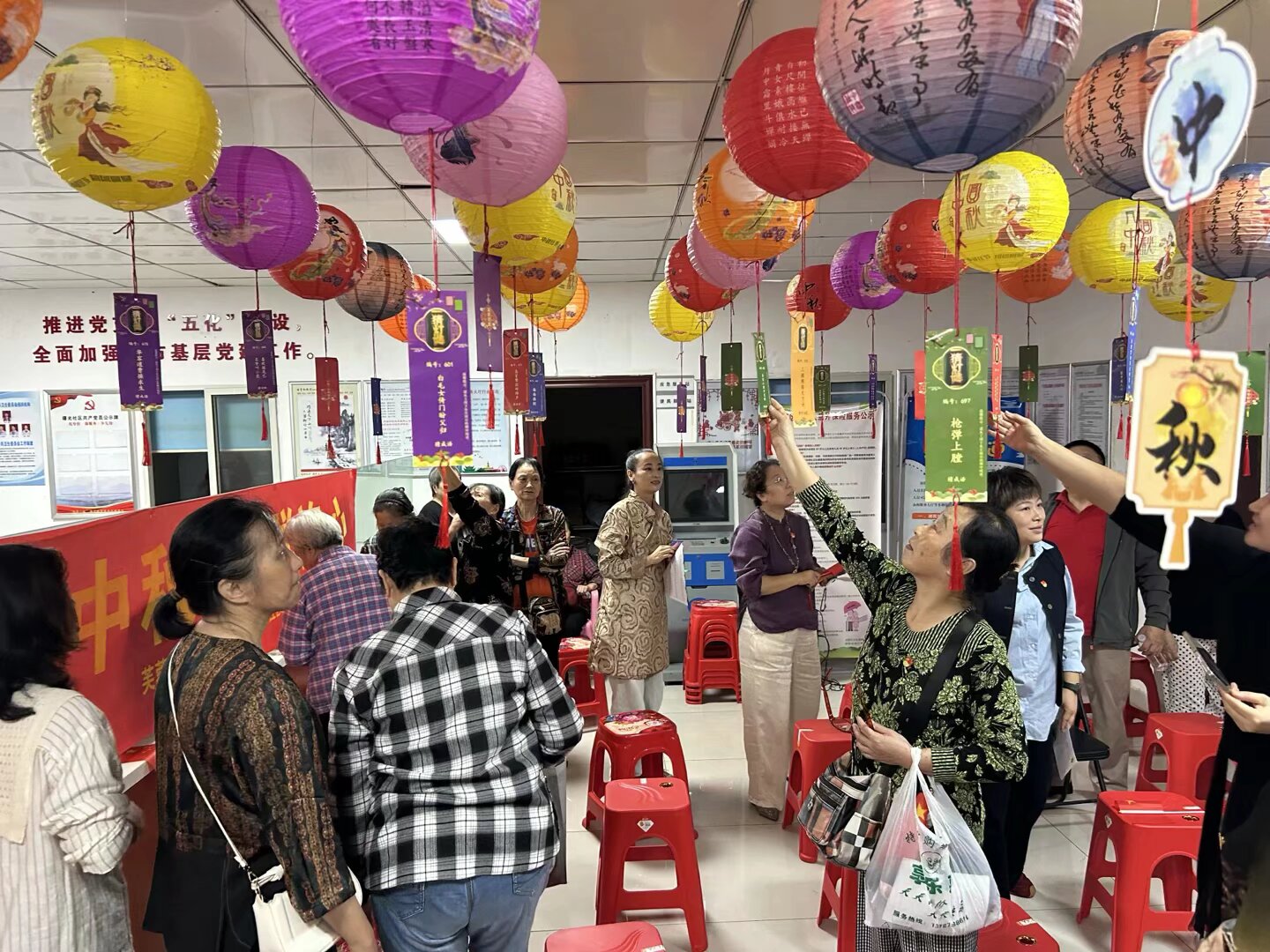 活动现场,手工制作月饼、猜灯谜等趣味活动有序开展。党员志愿者手把手指导居民制作月饼,揉匀面团、包入馅料,再将模具轻轻压下,一个个精致的月饼便成型。最热闹的当属“党建灯谜”环节,在“中共一大,载入史册(打一党务工作术语)”“听箫趁月清光下,唤客邀兄田舍边(中共党史人物)”等谜题前,财政局、社区党员们化身“红色讲解员”,借解谜契机讲解相关党史知识。