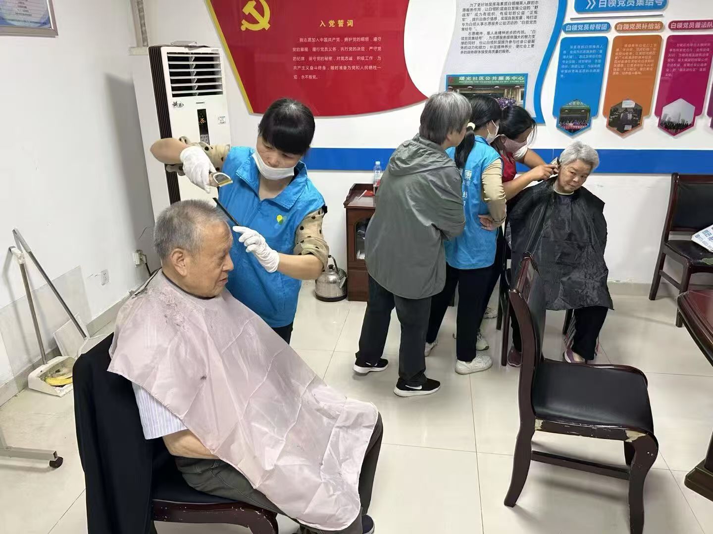 活动现场,党员志愿者提前布置好服务点位,有序引导居民参与。在血压测量区,志愿者耐心为居民测量血压,详细询问他们的日常饮食、用药情况等,结合健康知识给出饮食、运动等方面的建议。在理发服务区,志愿者根据居民的需求和喜好修剪发型,让每位居民都满意而归,进一步拉近了党支部与群众的距离。