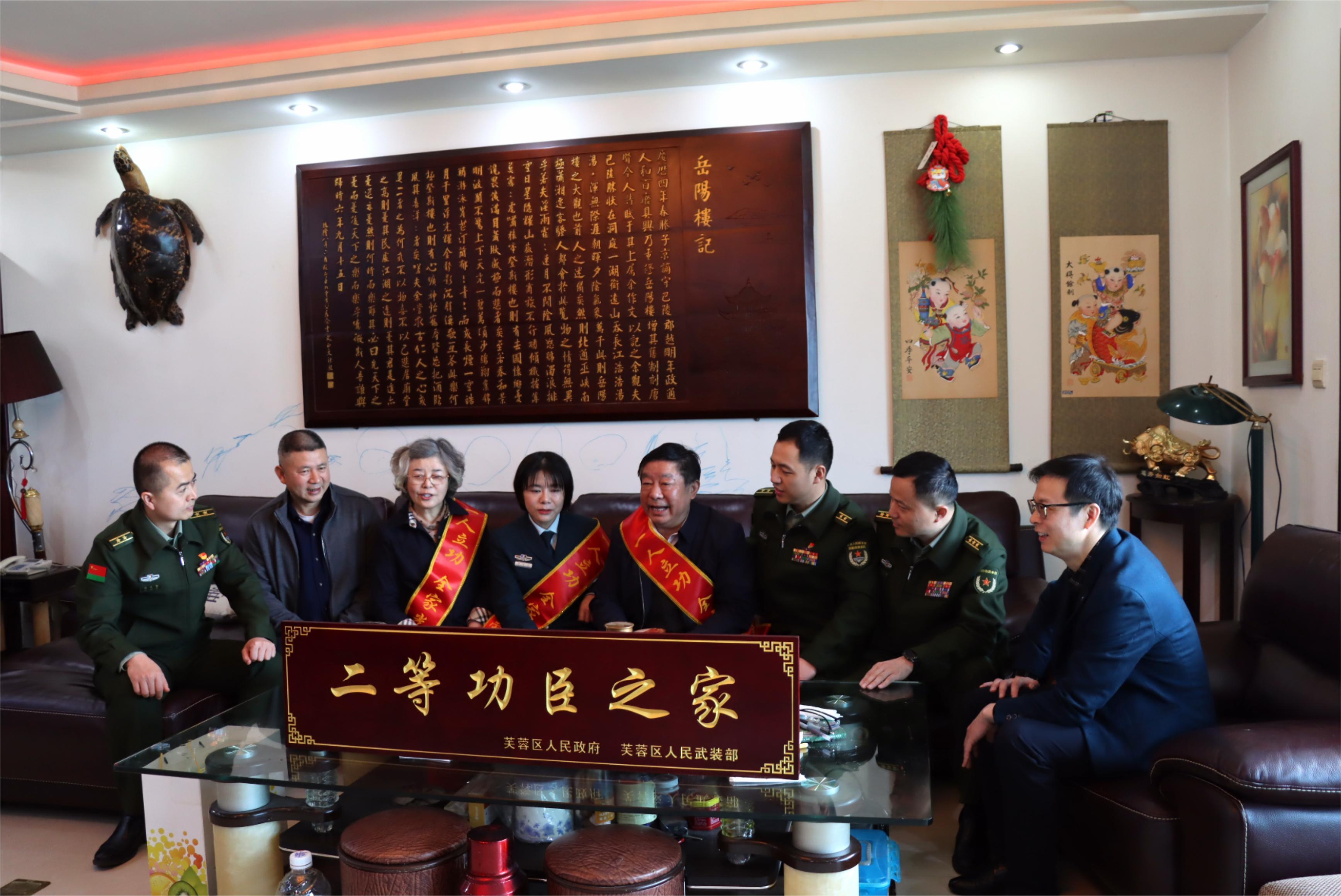 “军营建功业,喜报家乡传!”为弘扬拥军优属的光荣传统,营造尊崇军人的良好氛围,2024年3月28日上午,芙蓉区委常委、区人武部政委王黔军,区退役军人事务局局长梁卫,部队相关领导,韭菜园街道、军区社区退役军人服务站工作人员一行,为荣立二等功的现役军人李宇宁家庭送去二等功喜报和“二等功臣之家”牌匾及慰问金,向他们表示祝贺,送上党和政府的关怀与温暖。