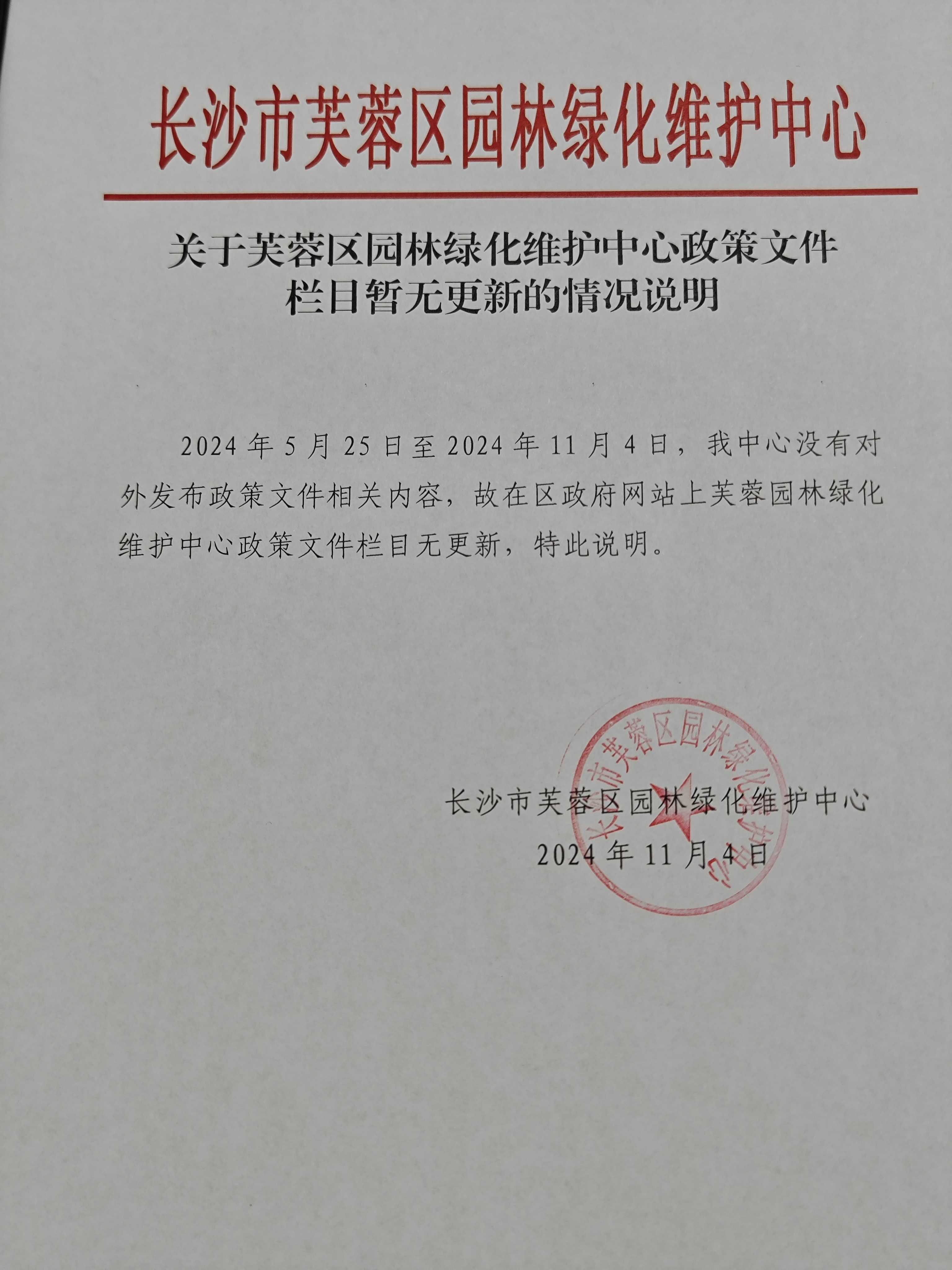 关于芙蓉区园林绿化维护中心政策文件栏目暂无更新的情况说明