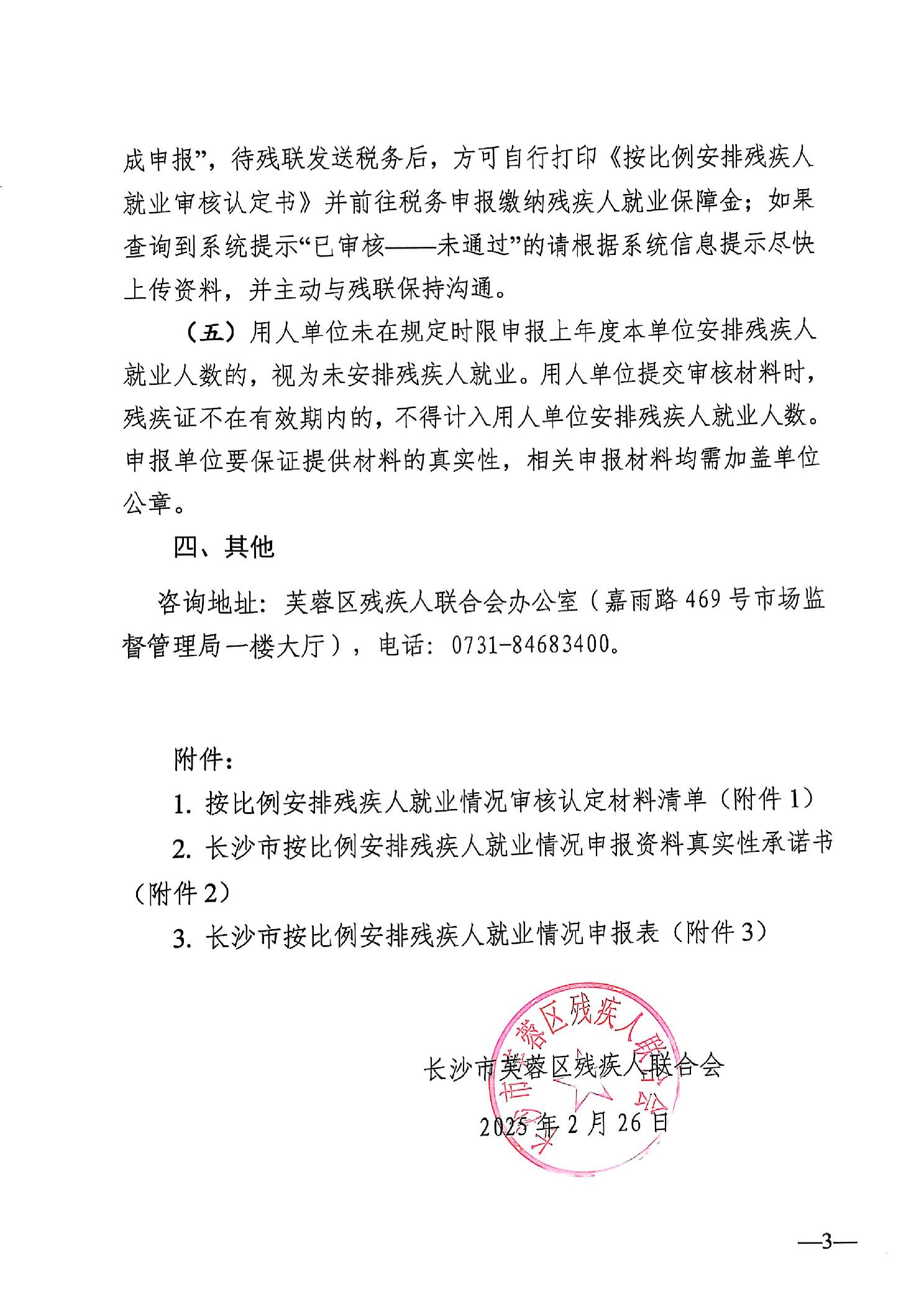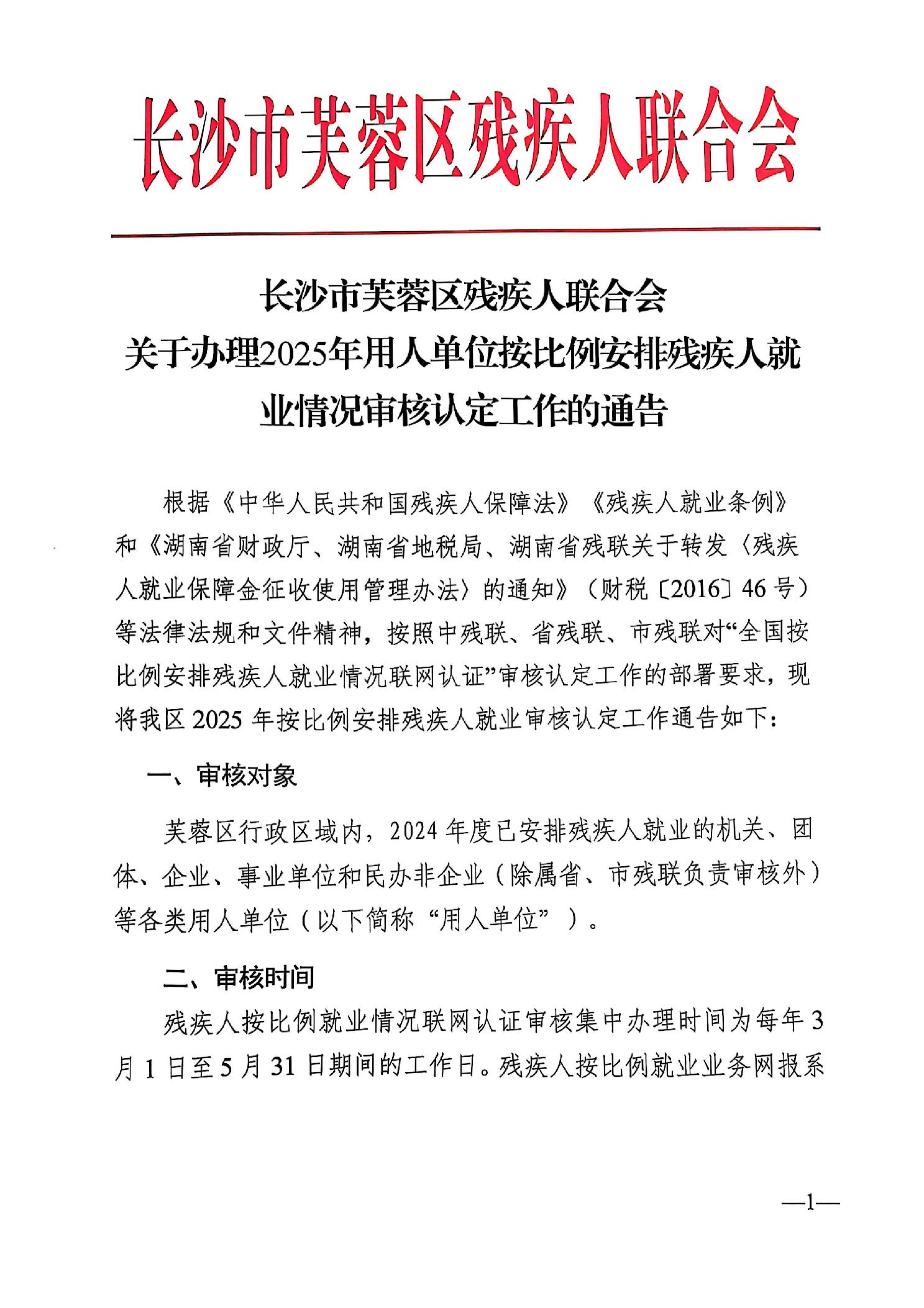 长沙市芙蓉区残疾人联合会关于办理2025年用人单位按比例安排残疾人就业情况审核认定工作的通告