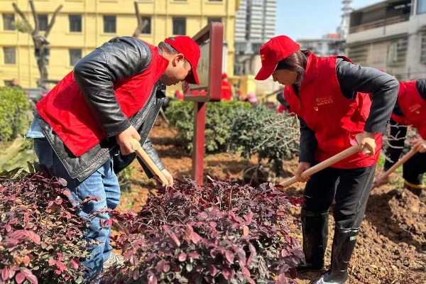 花园内,党员志愿者们身穿红马甲,挥锹铲土,扶苗培实,干得热火朝天。耕耘有希望,春华出秋实,经过一番辛勤劳动,一棵棵茶树、红梅、绣球花在花园种下,呈现出一派生机盎然的景象。