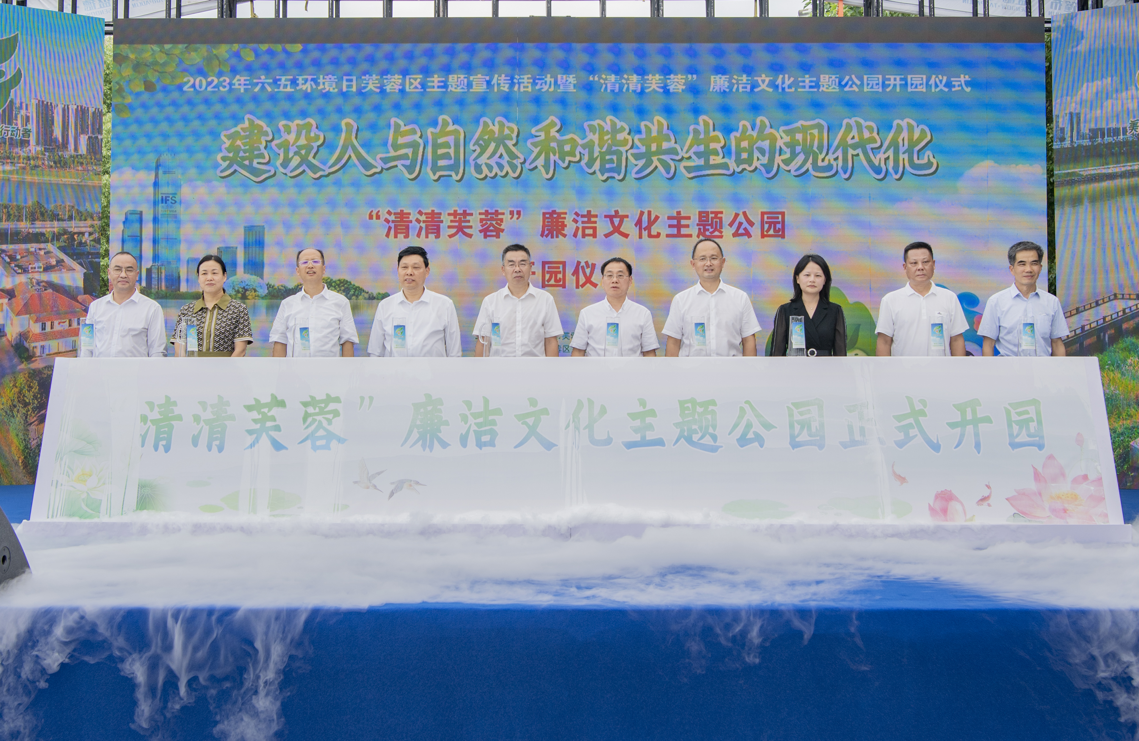 2023年62,芙蓉区举办六五环境日主题宣传活动暨“清清芙蓉”廉洁文化主题公园开园仪式。省农科院党委副书记、院长余应弘,省生态环境厅党组副书记、副厅长黄宇,省生态环境厅宣传教育与对外合作处处长彭石序,市生态环境局党组书记、局长张武,驻局纪检组长向建州,市纪委监委三级调研员陈爱国,芙蓉区领导周春晖、何溪桥、伍艳飞、喻志刚、彭保刚、陈亚静、李明权、文升云、陈庆等出席活动。