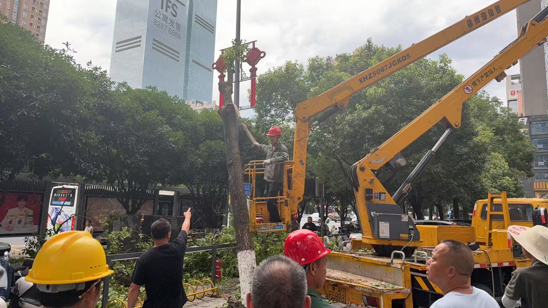 面对悬于城市“主动脉”上空的险情,专业处置是关键。杨鹏靠前指挥,精准调度:升降机迅速定位高危枝干;技术人员手持油锯,在高空作业平台上对巨大断枝实施分段切割、精准卸载;地面人员同步设置警戒,高效清障。整个排危过程紧张有序、专业高效,5分钟内完成警戒,30分钟解除主要倾倒风险,最终清运断枝杂物2吨,未明显影响主路交通。