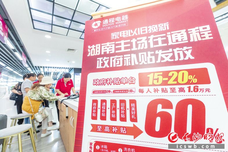 消费者在通程电器东塘店选购家电,店内“以旧换新”标识和补贴发放流程等非常醒目。