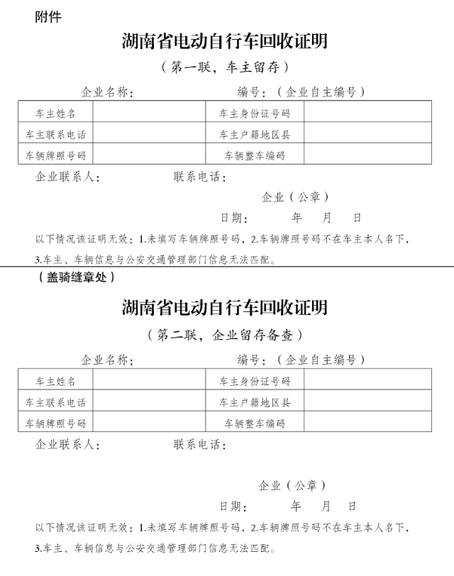 6.交售旧车的上牌信息截图或照片、回收证明(见附件)。回收证明由电动自行车销售的商户出具并加盖公章,仅回收带号牌号码的旧电动自行车,不带号牌号码的旧电动自行车不在补贴范围之内,不得出具回收证明。